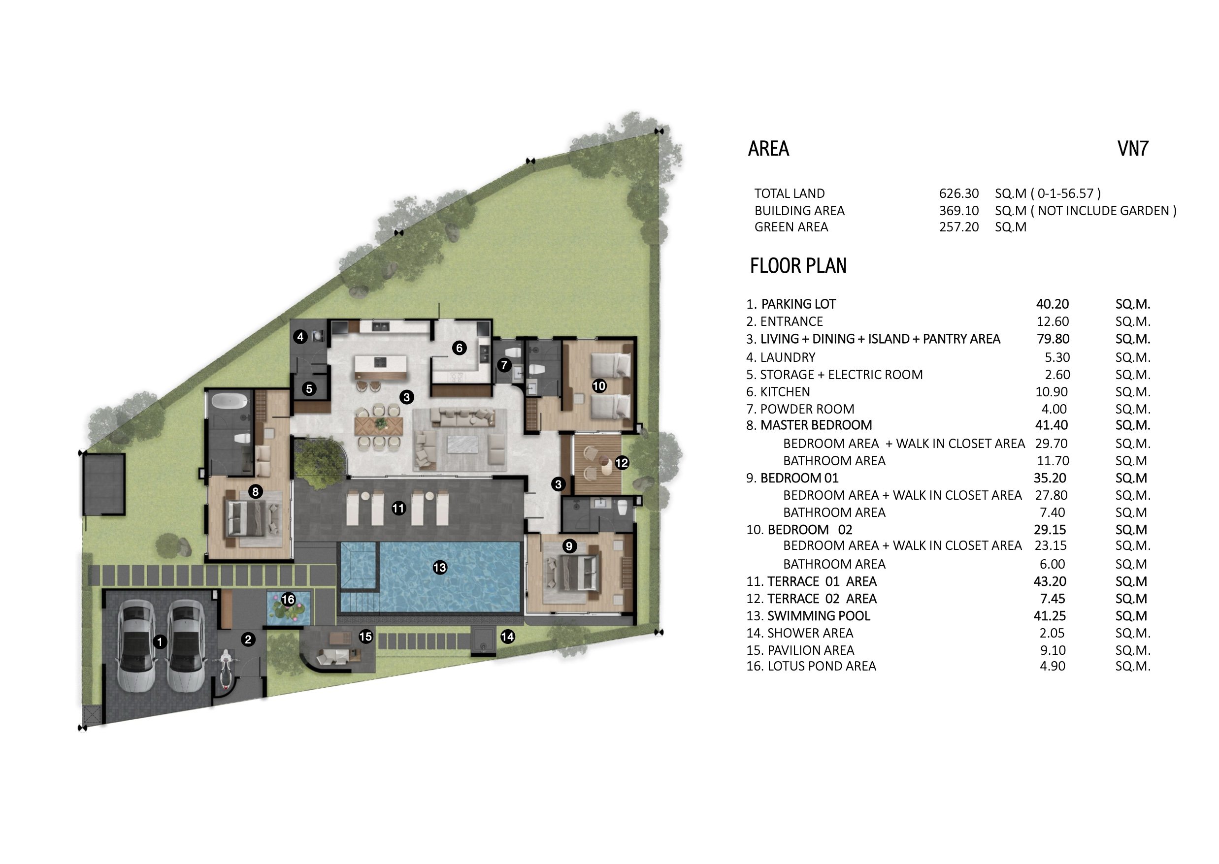 Проект состоит всего из семи приватных одноэтажных вилл, что обеспечивает высокий уровень уединённости и ощущение закрытого клубного формата. Каждая вилла спроектирована с акцентом на простор, функциональность и комфорт современной жизни. Площади участков и домов позволяют создать полноценное жилое пространство, подходящее как для семейного проживания, так и для длительного отдыха.