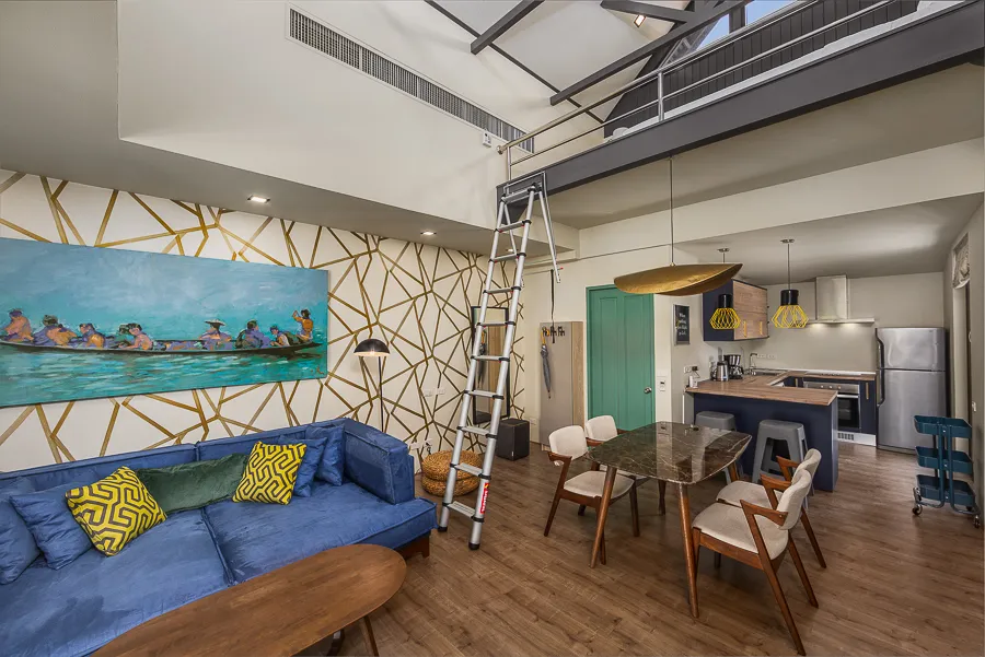Апартаменты состоят из просторной гостиной с потолками высотой 5 метров, кухни, спальни, ванной комнаты, мезонина с двумя дополнительными спальными местами и террасы с видом на