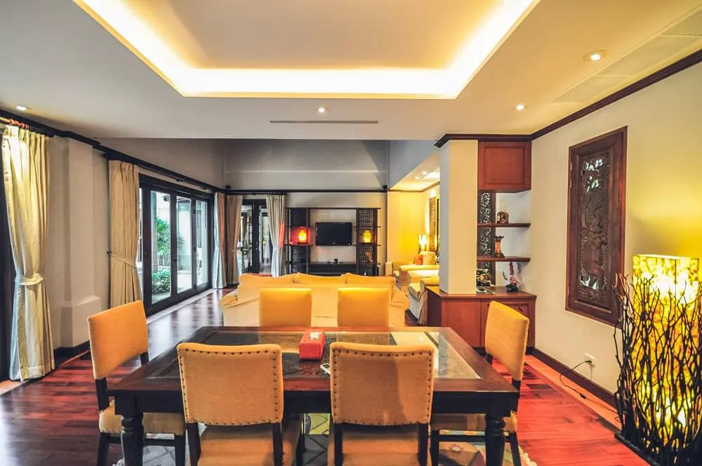 На просторном участке расположена шикарная одноэтажная вилла, каждая спальня которой имеет собственный выход к 10-метровому бассейну с джаккузи. Три спальни находятся в основном здании, а четвертая спальня представляет собой отдельный павильон в саду, сохраняя абсолютную приватность для своих гостей. У каждой спальни - собственная ванная комната. Просторная гостиная , удобная кухня, столовая с обеденным столом на 8 персон, также имеют прямой выход на террасу к бассейну. Все помещения виллы отделаны натуральным тиковым деревом,