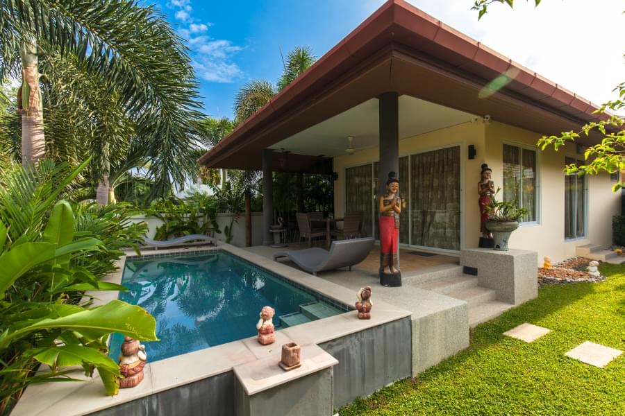 Вилла-бунгало площадью 115 м2 располагает одной спальней, ванной комнатой, гостиной, кухней и террасой. Спальня оснащена большой двуспальной кроватью На просторной террасе есть обеденный стол и прямой доступ к частному бассейну. Рядом с бассейном можно отдохнуть на шезлонгах в окружении зеленого тропического сада с деревьями и цветами.