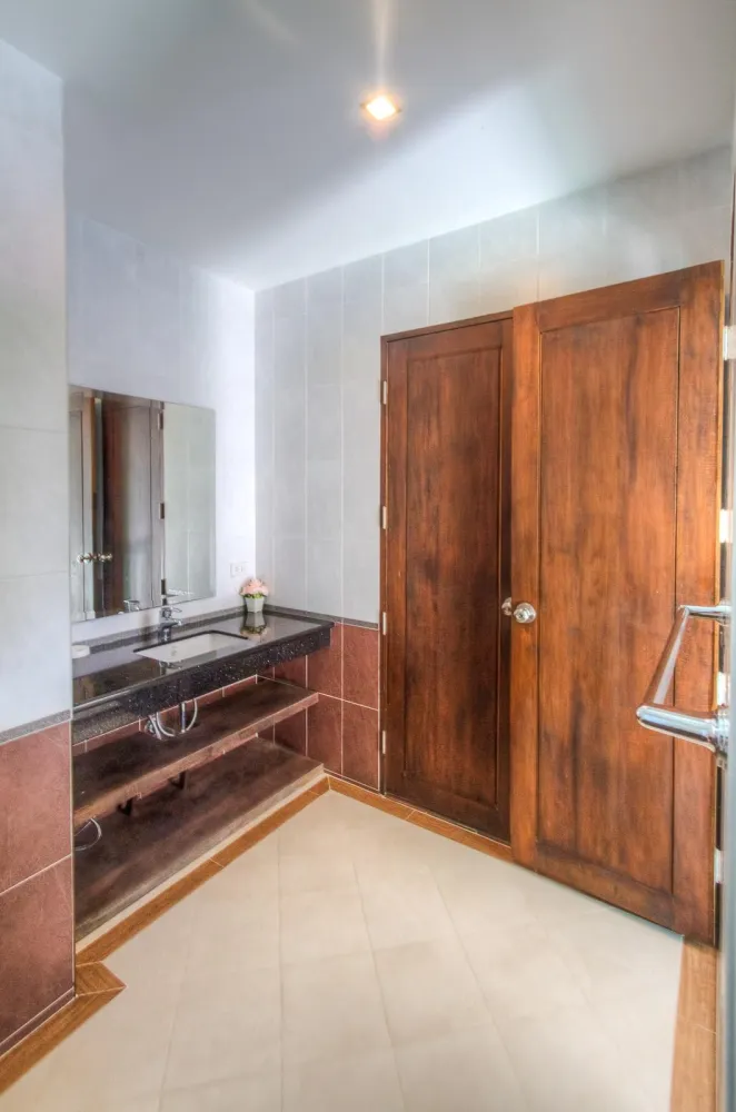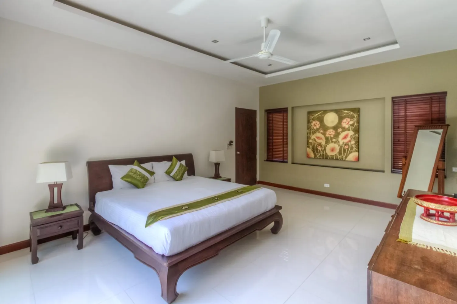 Вилла располагает тремя спальнями, тремя ванными комнатами, гостиной, кухней и террасой. Все комнаты украшены разнообразными предметами интерьера и картинами. В спальнях размещены большие двуспальные кровати, а в гостиной удобный диван, телевизор и небольшой стол. Кухня укомплектована всем необходимым, начиная от холодильника и заканчивая кофеваркой.