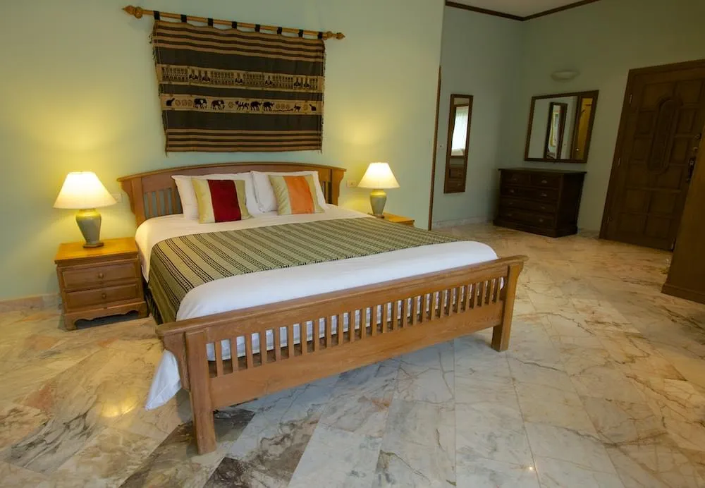 Вилла имеет 6 просторных спальных комнат и способна с легкостью разместить до 14 человек. Первая спальная комната оснащена одной двуспальной и одной односпальной кроватями и имеет возможность размещения трех взрослых человек, комната обладает собственной ванной и имеет входную дверь в соседнюю комнату, которая может с комфортом разместить еще двух взрослых. В следующей комнате также как и в первой могут разместиться трое, она имеет собственный санузел с ванной и душем. В двух других комнатах двуспальные кровати. Шестая комната имеет две односпальные кровати и небольшую собственную мини-кухню, что делает ее идеальной для гостей, которые хотят некоторую дополнительную уединенность. Четыре комнаты имеют выход к бассейну и собственные гардеробные комнаты. Все комнаты оснащены кондиционерами и потолочными вентиляторами. Вилла хорошо оборудована, она оснащена всей необходимой мебелью для комфортного проживания.