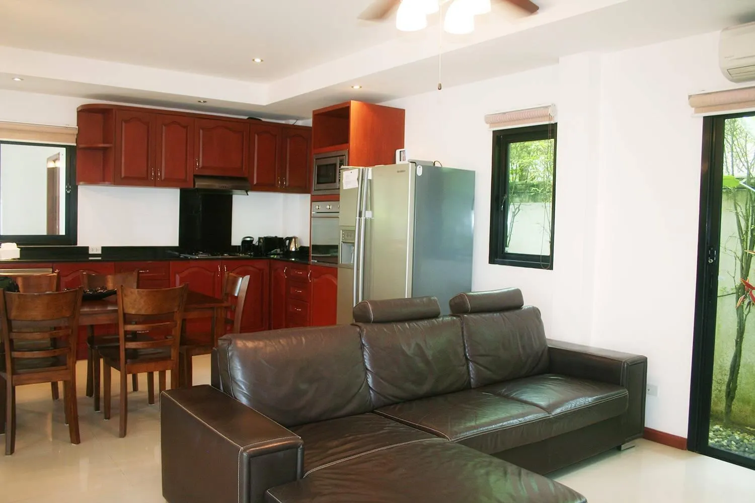 Вилла располагает тремя спальнями, две из которых имеют отдельный выход к личному бассейну. Третья спальня - в отдельном бунгало. Каждая спальня оснащена кондиционером и телевизором. В гостиной - комфортный диван, на котором с легкостью сможет разместиться вся кампания, а также вся необходимая цифровая техника (домашний кинотеатр, двд-плеер и тд). В столовой зоне - стол на 6 персон и кухня, на которой Вы найдете все необходимое, начиная от посуды и заканчивая посудомоечной машиной.
