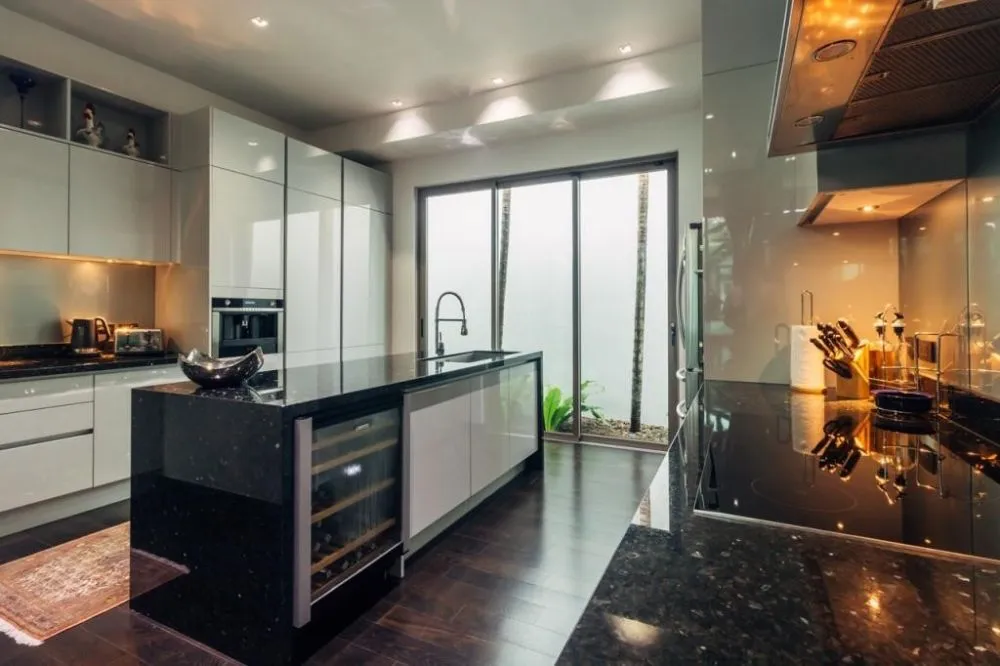 При входе на виллу вы войдете в первый из 3 павильонов, здесь вы увидите гостиную / столовую открытой планировки с видом на пышные тропические сады и большой бассейн. Кроме того, кухня гораздо лучше оборудована, чем можно было ожидать. Кухня включает в себя бытовую технику SMEG, огромный 4-дверный холодильник с морозильной камерой и двухзонный холодильный шкафчик для вина.