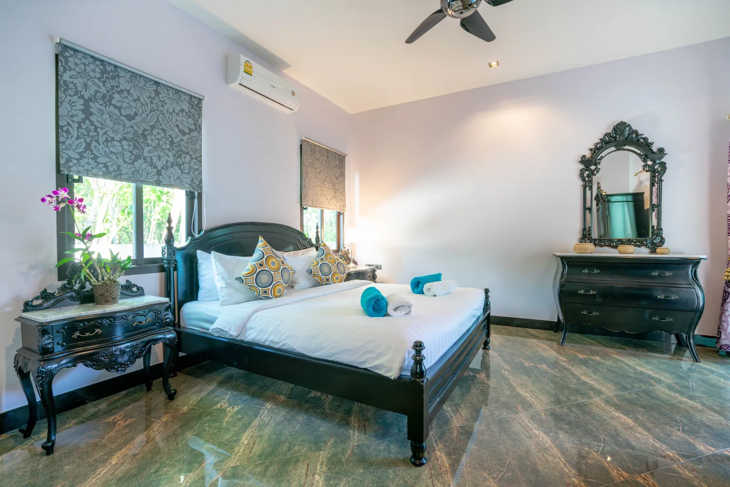 Вилла располагает четырьмя просторными спальнями с отдельными ванными комнатами. Из всех спален открывается панорамный вид на бассейн площадью 60 кв.м. Рядом с бассейном находится крытая беседка с комфортным диваном и барной стойкой для шумных вечеринок. Вилла полностью обставлена качественной мебелью и имеет уникальный, яркий дизайн, который подарит вам хорошее настроение и положительный заряд бодрости на весь день. Женщин наверняка порадует тот факт, что на вилле имеется большой просторный гардероб, а также кухня, оборудованная