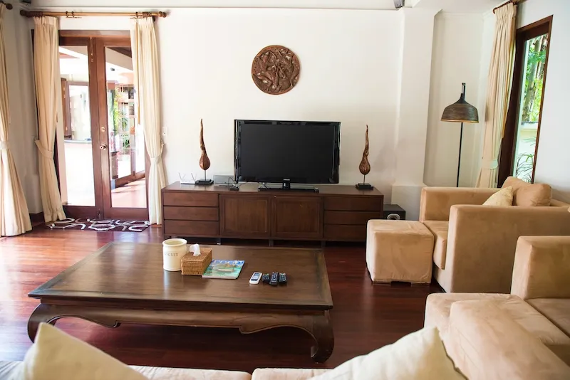 Вилла построена в одном уровне и каждая ее спальня имеет выход к 10-метровому бассейну с джаккузи. Четвертая спальня представляет собой отдельный павильон в саду, сохраняя приватность на высоком уровне. Все комнаты декорированы балийской мебелью и предметами интерьера ручной работы. Просторная гостиная , удобная кухня, столовая с обеденным столом на 8 персон, также имеют прямой выход на террасу к бассейну .