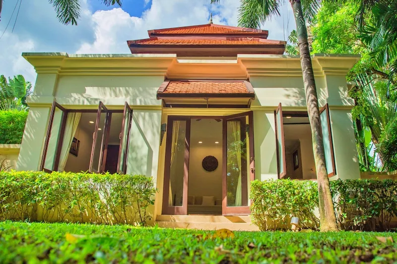 Saitaan - одна из крупнейших резиденций Пхукета. Проект состоит из 48 роскошных вилл в балинезийском стиле с крышами из красной черепицы, площадью от 450 м2, каждая от 3 до 5 спален. Весь проект выполнен в едином стиле, типичная планировка виллы - это основное здание Г-образной формы, в котором расположены гостиная, кухня, несколько изолированных друг от друга спален со своими ванными комнатами и комната горничной. В отдельном павильоне расположена гостевая спальня с ванной комнатой. В центре большой плавательный бассейн с джаккузи. бар и крытая беседка для отдыха. У каждой виллы - собственная крытая парковка. Виллы огороженыны друг от друга и абсолютно приватны. Проект буквально утопает в тропической зелени и цветах.