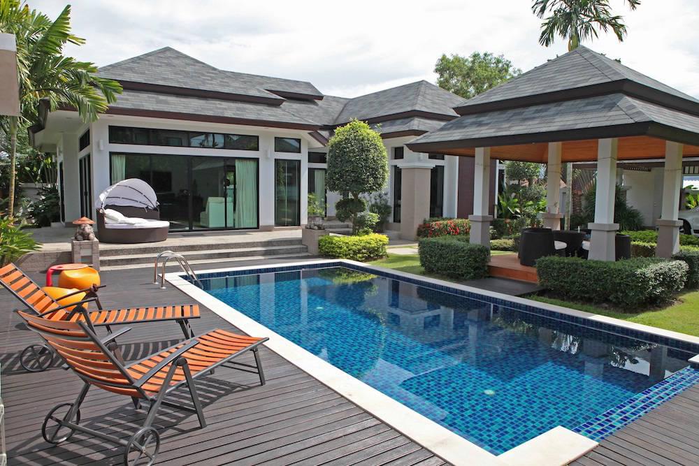 Вилла площадью 350 кв.м находится на просторном участке 750 кв.м и окружена красивым, ландшафтным садом. Рядом с бассейном имеется BBQ бар с печью и обеденным столом, который расположен в уютной беседке-сала. Бассейн окрамлен деревянной террасой, на которой