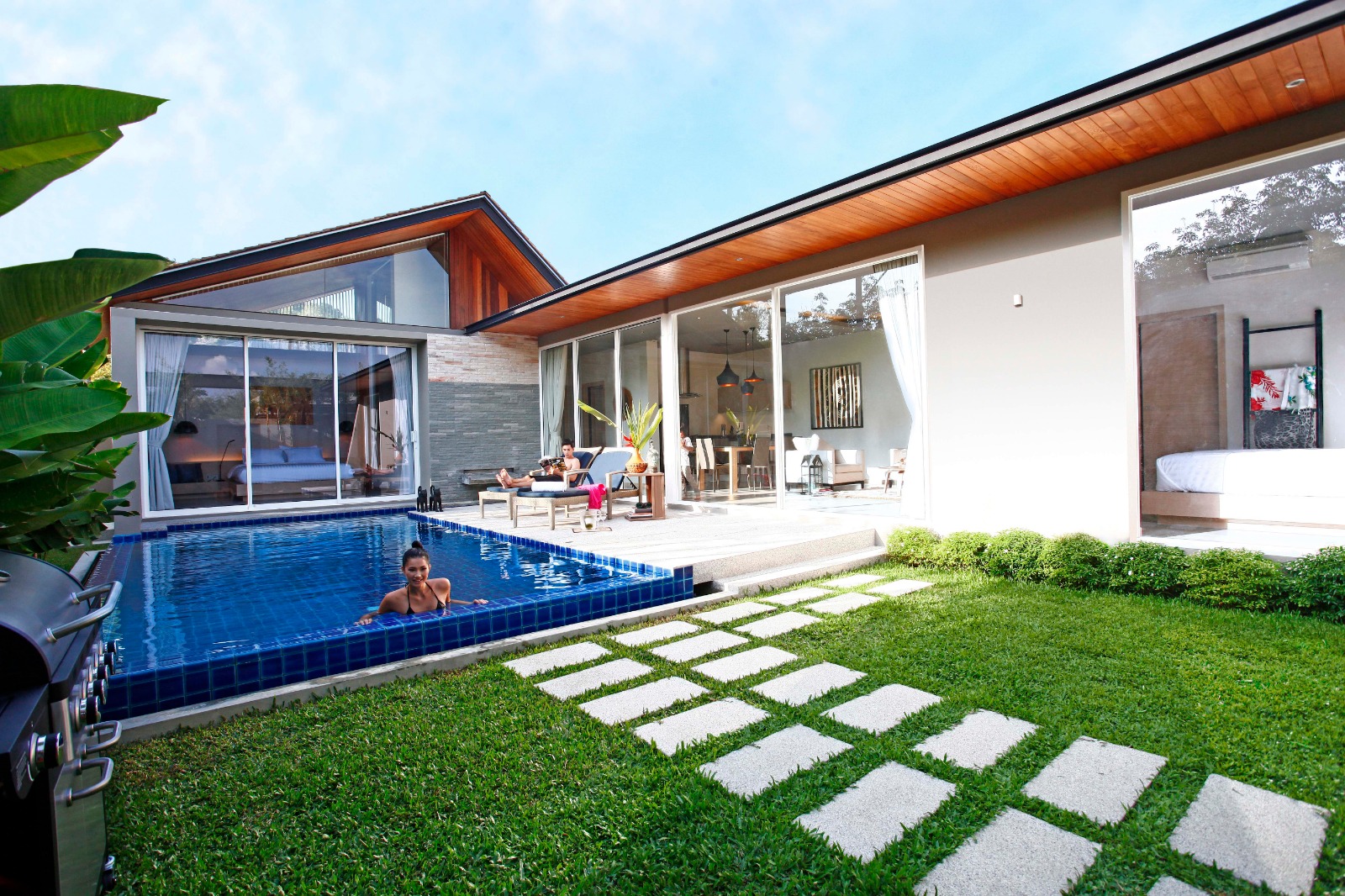 Вилла располагает просторной гостиной, европейской кухней, тремя спальнями с собственными ванными комнатами. Вилла со вкусом меблирована и декорирована. Панорамные окна дарят возможность любоваться великолепным видом на сад и бассейн.
